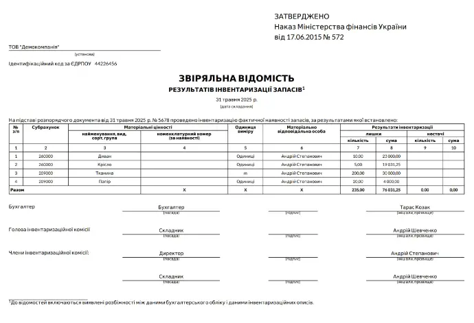 Зробіть в Odoo коригування залишків, збережіть інвентаризаційний опис, заповніть комісію і бухгалтера та роздрукуйте інвентаризаційний опис і звіряльну відомість.