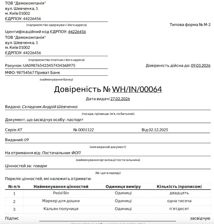 Купуйте товари та видавайте довіреність співробітнику на їх отримання. Роздрукуйте типову форму М-2 із документу надходження в Odoo.