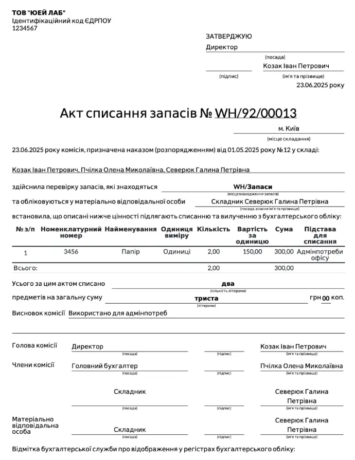 Спишіть в Odoo товари на витрати або брак та роздрукуйте типову форму акту списання.